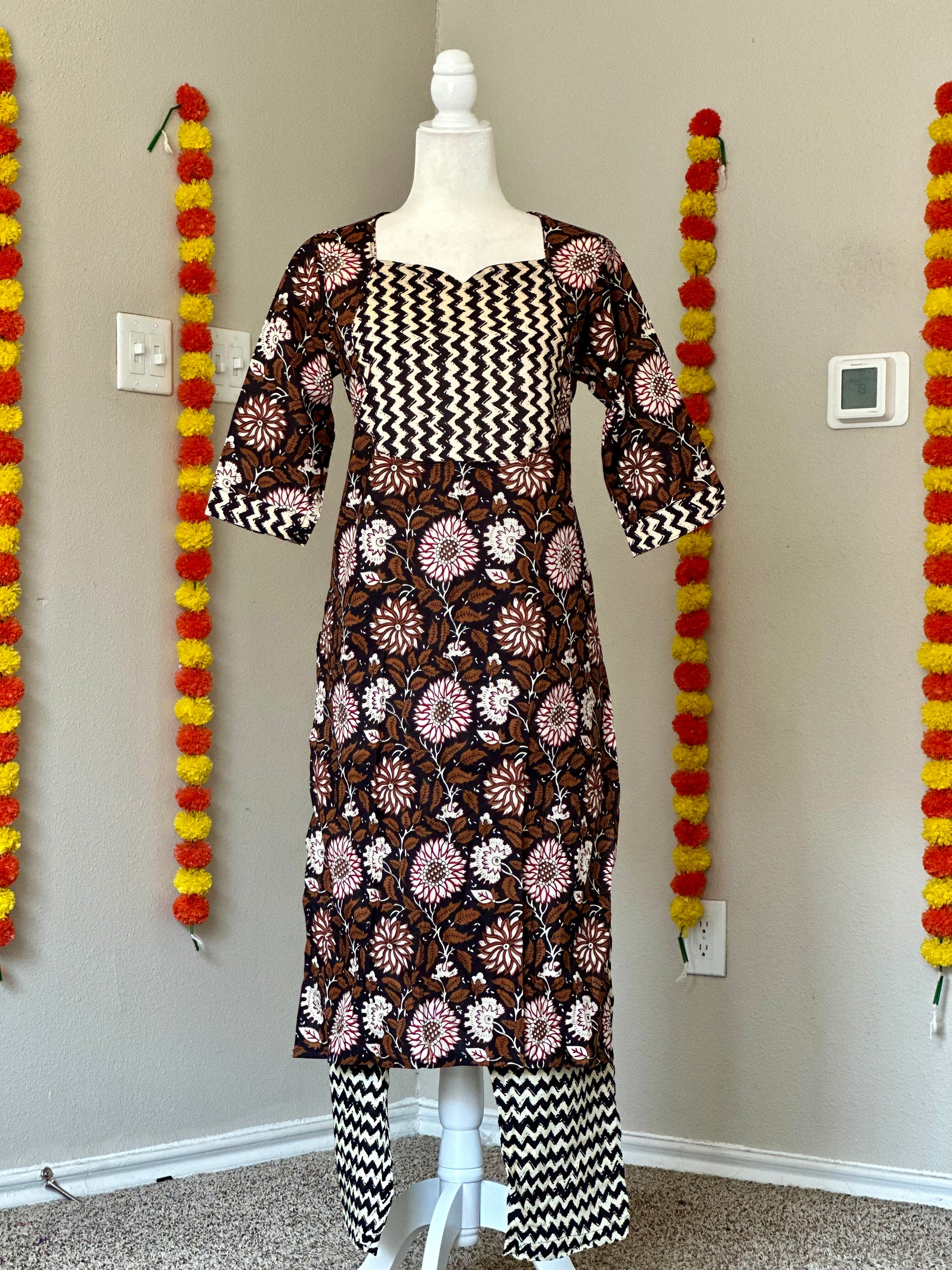 This distinguished black and brown floral printed coord set represents high-quality cotton, the two-piece ensemble delivers optimal temperature regulation and skin-friendly comfort. The intricate floral print, rendered in sophisticated black and brown hues, creates a versatile aesthetic suitable for diverse styling contexts.
