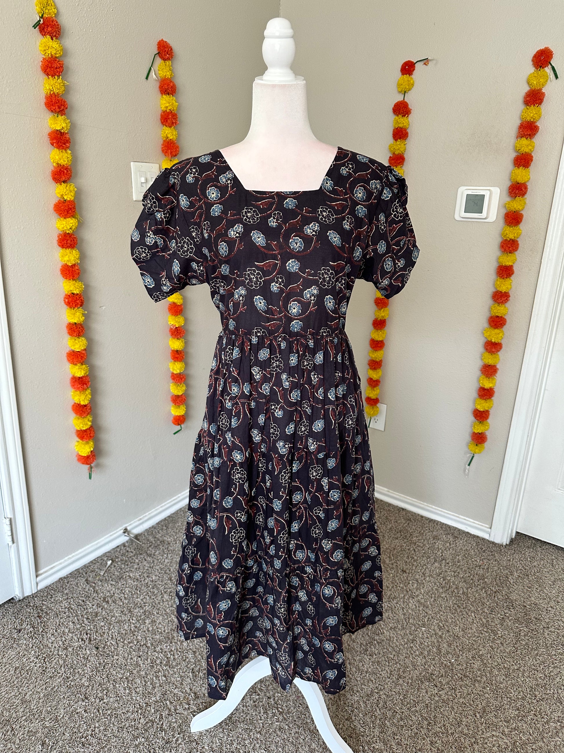 This premium black cotton summer dress combines sophisticated floral patterning with a structured three-tier silhouette. The refined square neckline frames the décolletage beautifully, while the distinctive variation on traditional puff sleeves adds interest. Crafted from high-quality cotton for superior breathability and comfort during warm weather occasions.
