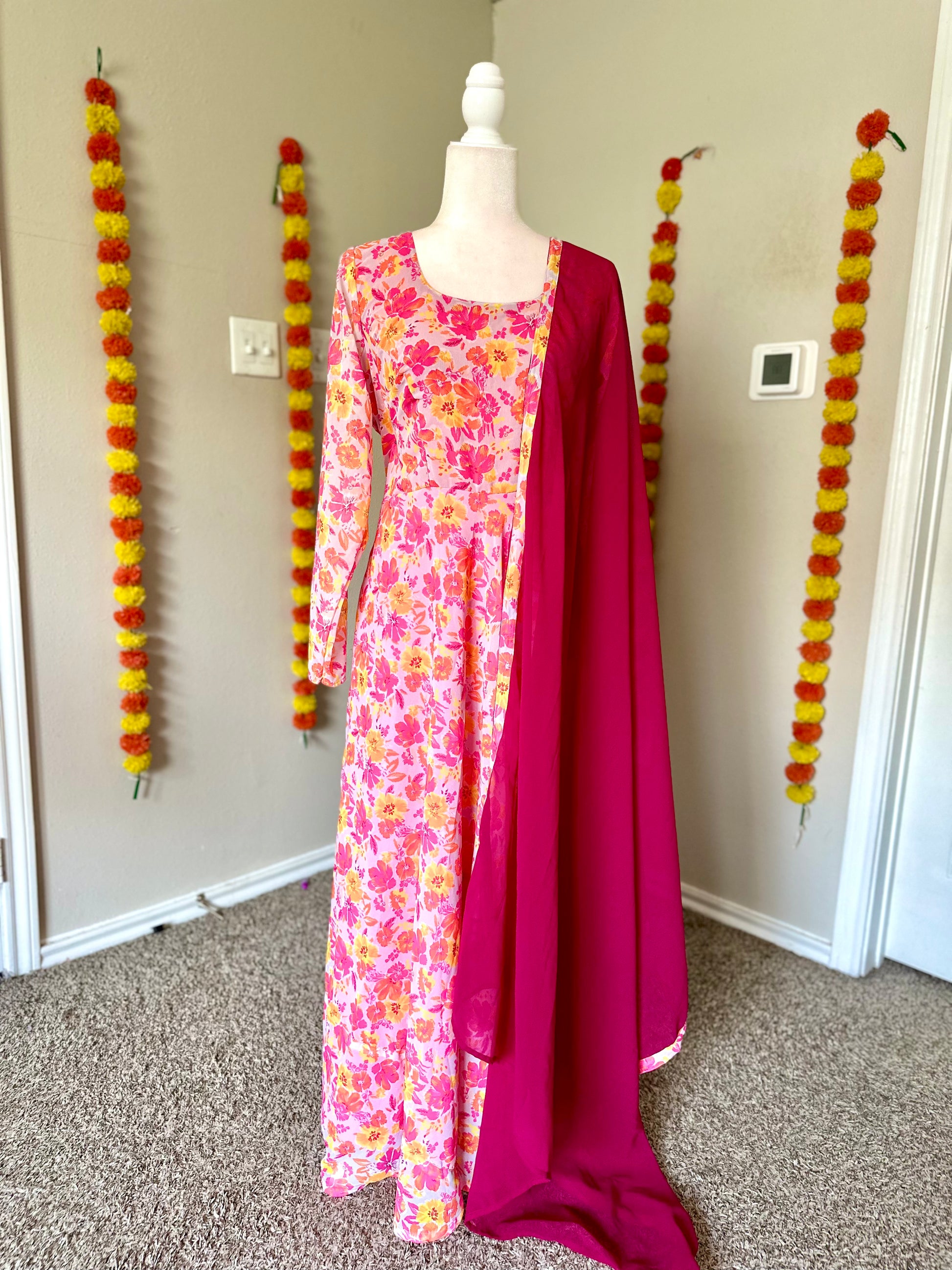 Beautifully crafted pink floral georgette two-piece set. Fully lined with premium crepe for comfort and opacity. The silhouette offers generous flare while the full sleeves add sophistication. Perfect for those seeking both style and graceful movement in a coordinated ensemble.