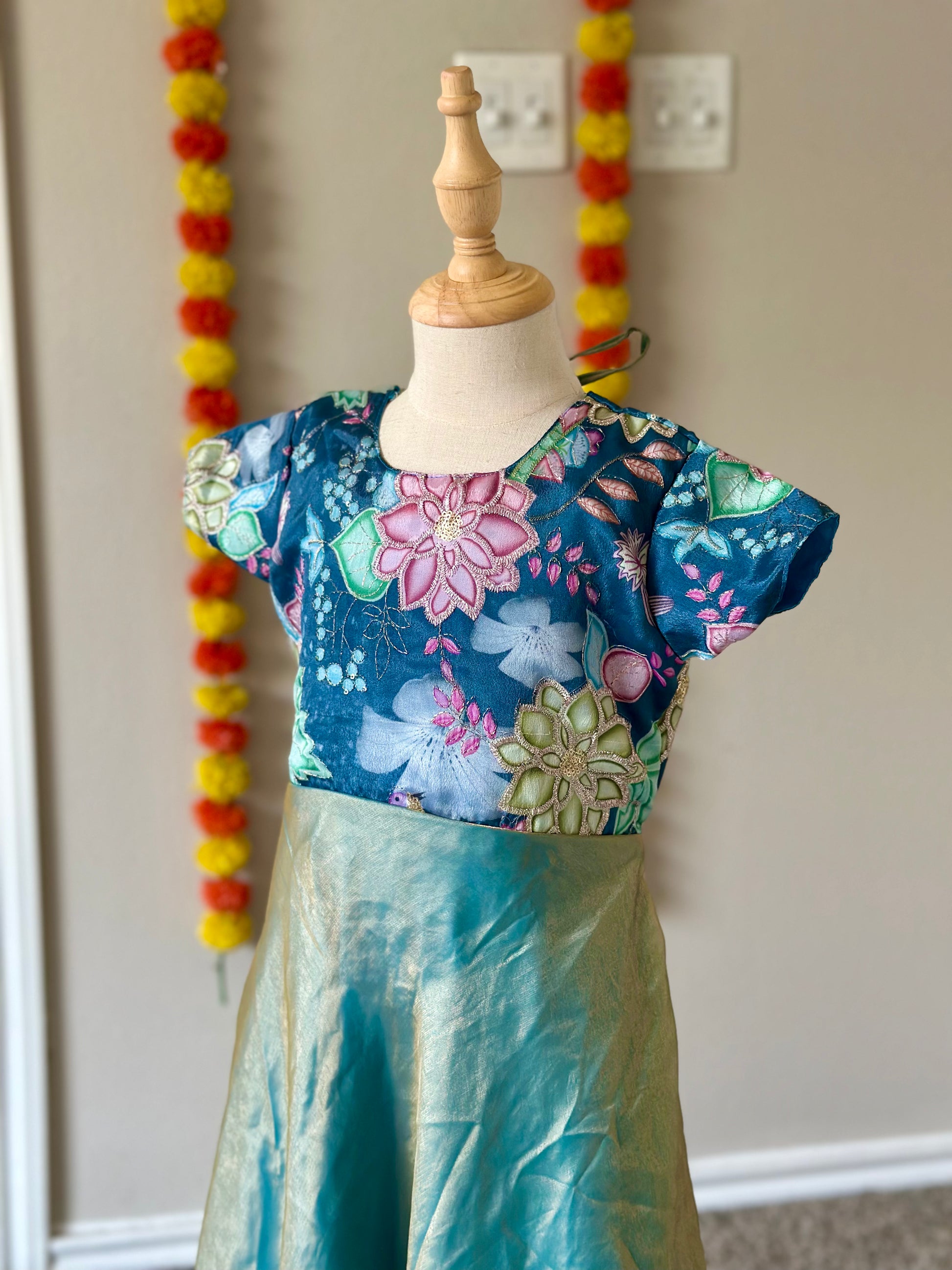 This blue embroidered kids' party wear maxi features a chinnon embroidered yoke paired with a space silk skirt and crepe lining for comfort and elegance. Designed with cute cap sleeves and a stylish back neck cutout, it fastens with a delicate tying rope adorned with tassels. Ideal for parties and festive occasions, this dress combines intricate detailing with a comfortable fit to ensure your child looks charming and feels confident at any celebration.