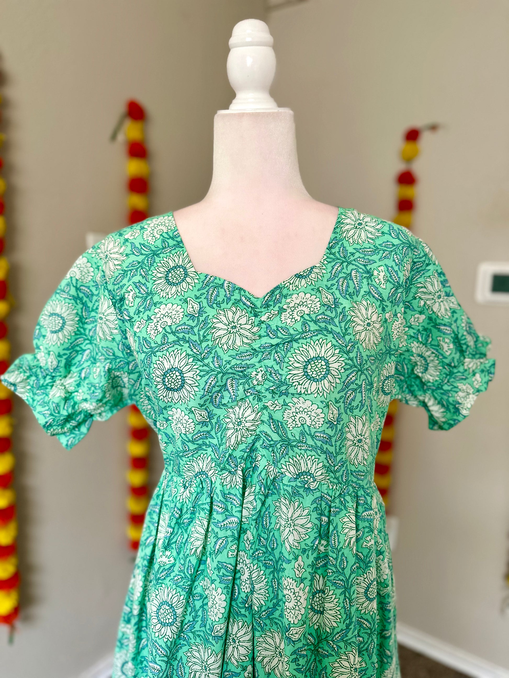 This Blue Green cotton summer dress combines functionality with sophisticated design elements. The elasticated puff sleeves create structured volume while the sweetheart neckline frames the décolletage elegantly. The two-tier construction offers fluid movement, complemented by an elasticated yoke that provides both comfort and a textured appearance. Premium cotton fabric ensures breathability and durability for seasonal versatility.