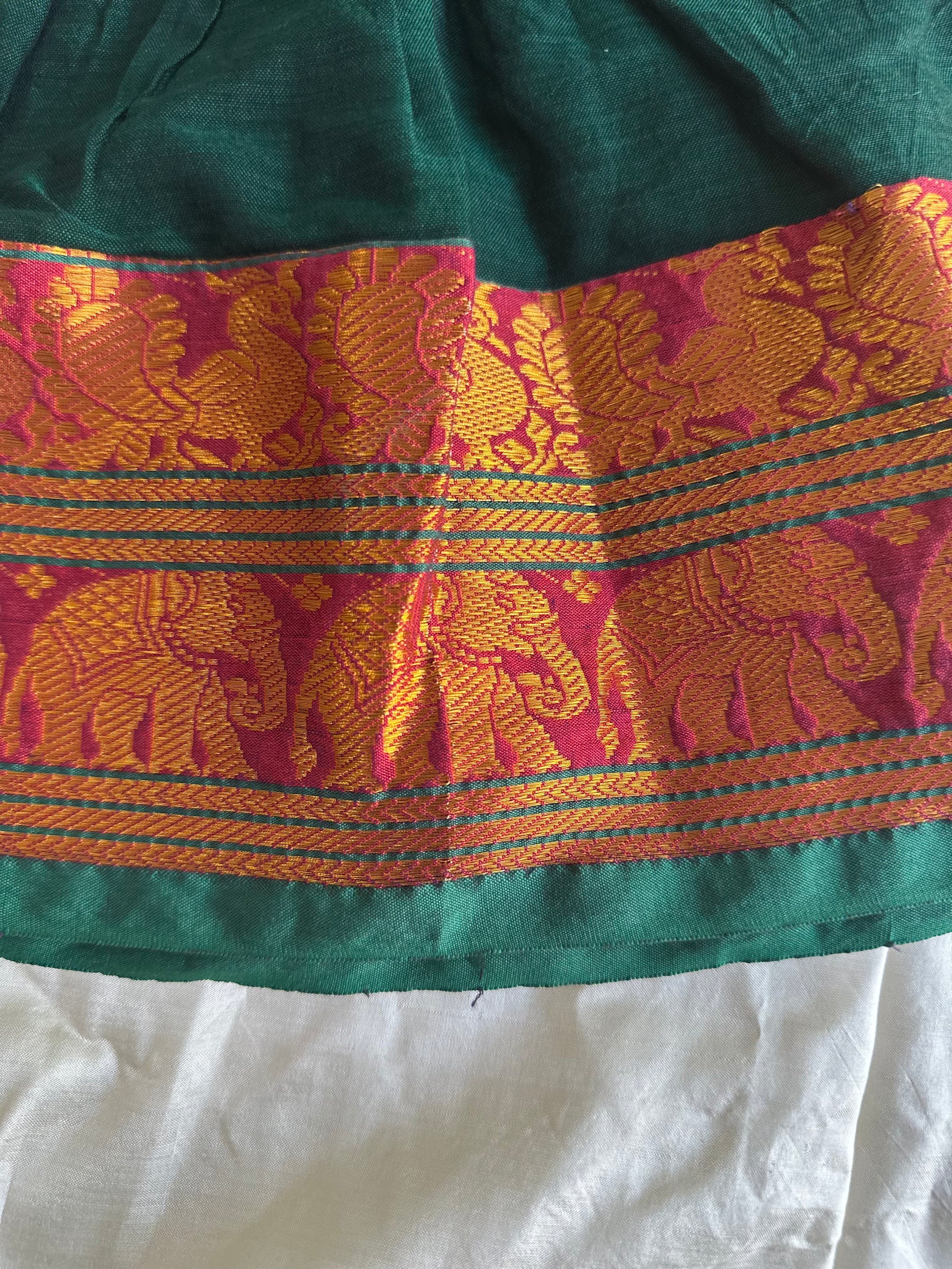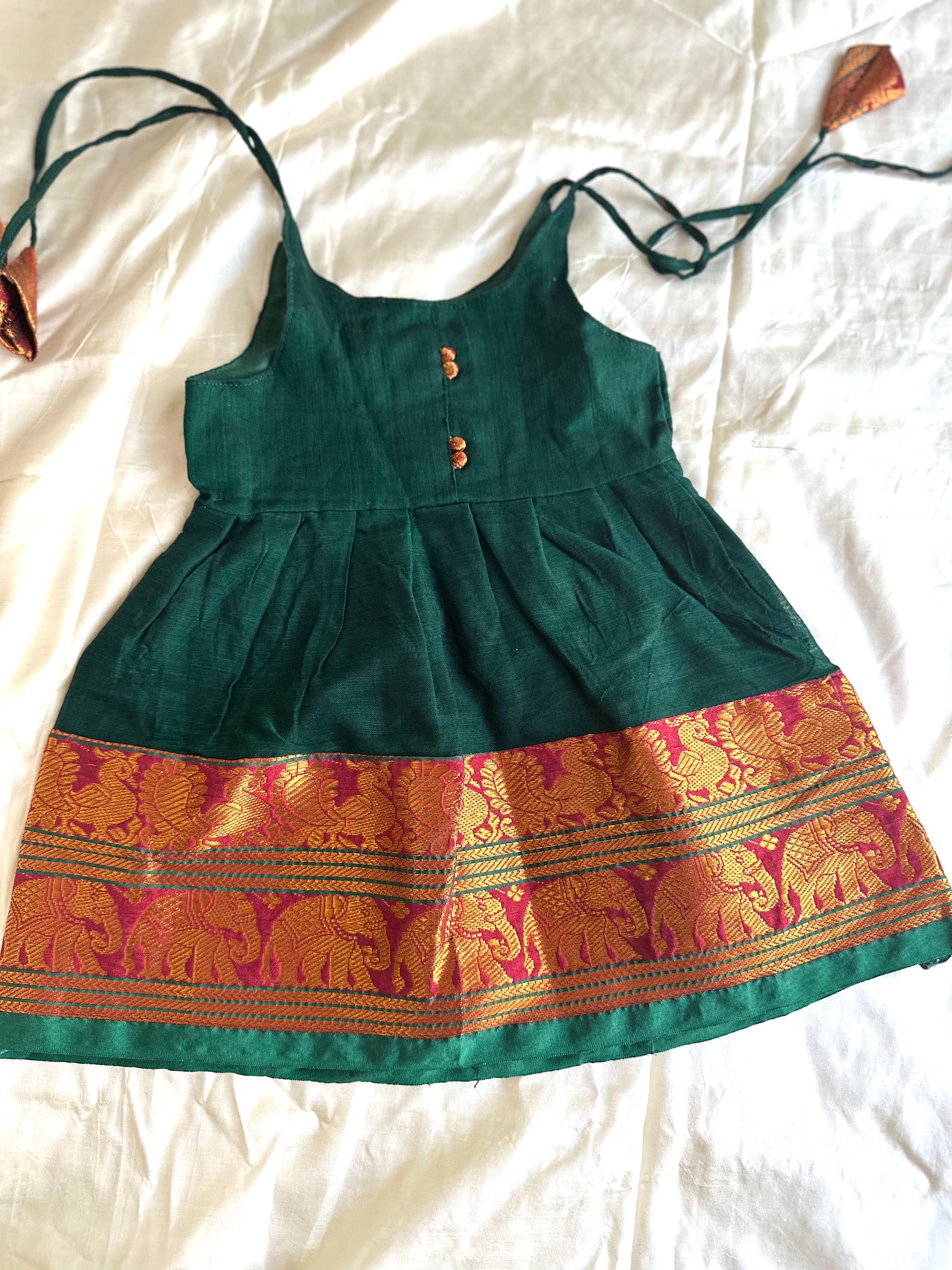This green Narayanpet tie-up frock combines elegance with comfort, featuring a smooth semi-silk exterior and a breathable 100% cotton lining. Its contrast border ensures a perfect fit, making it ideal for both casual and semi-formal occasions. The natural cotton lining enhances comfort, while the rich bottle green shade adds a sophisticated touch to your wardrobe.