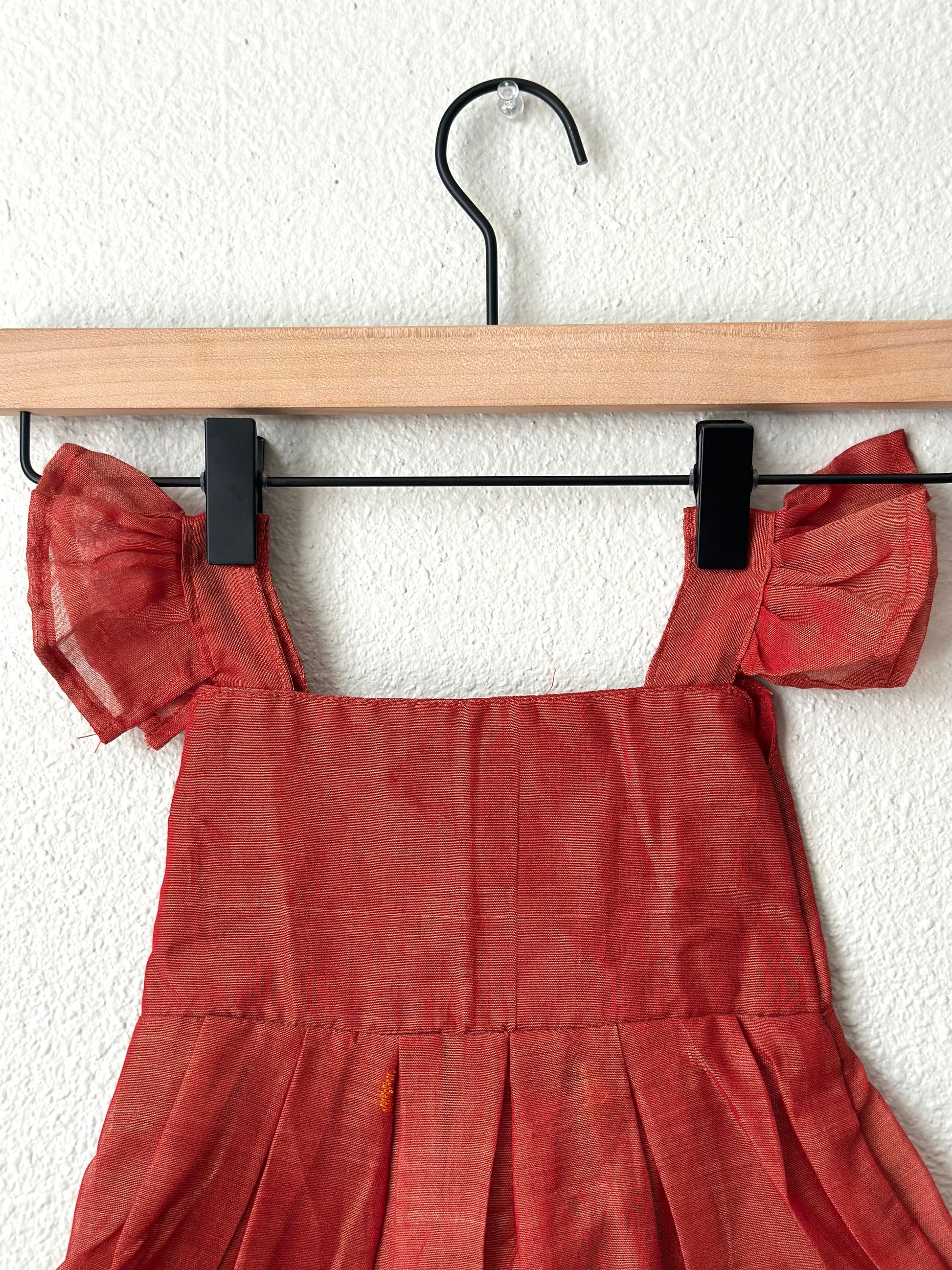 This orange Narayanpet infant frock features a unique color combination that beautifully mirrors the elegance of silk while being crafted in soft, breathable cotton. Designed with delicate baby skin in mind, it is free from any itchy or poky textures, ensuring gentle comfort. Expertly made to provide a skin-friendly and stylish option, this frock blends traditional design with practical wearability for infants.