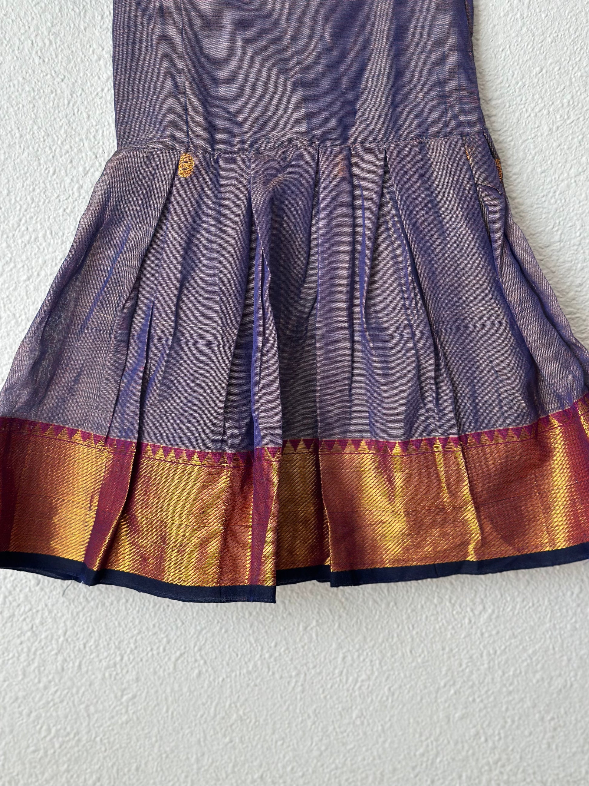 This purplish Narayanpet infant frock features a unique color combination that beautifully mirrors the elegance of silk while being crafted in soft, breathable cotton. Designed with delicate baby skin in mind, it is free from any itchy or poky textures, ensuring gentle comfort. Expertly made to provide a skin-friendly and stylish option, this frock blends traditional design with practical wearability for infants.