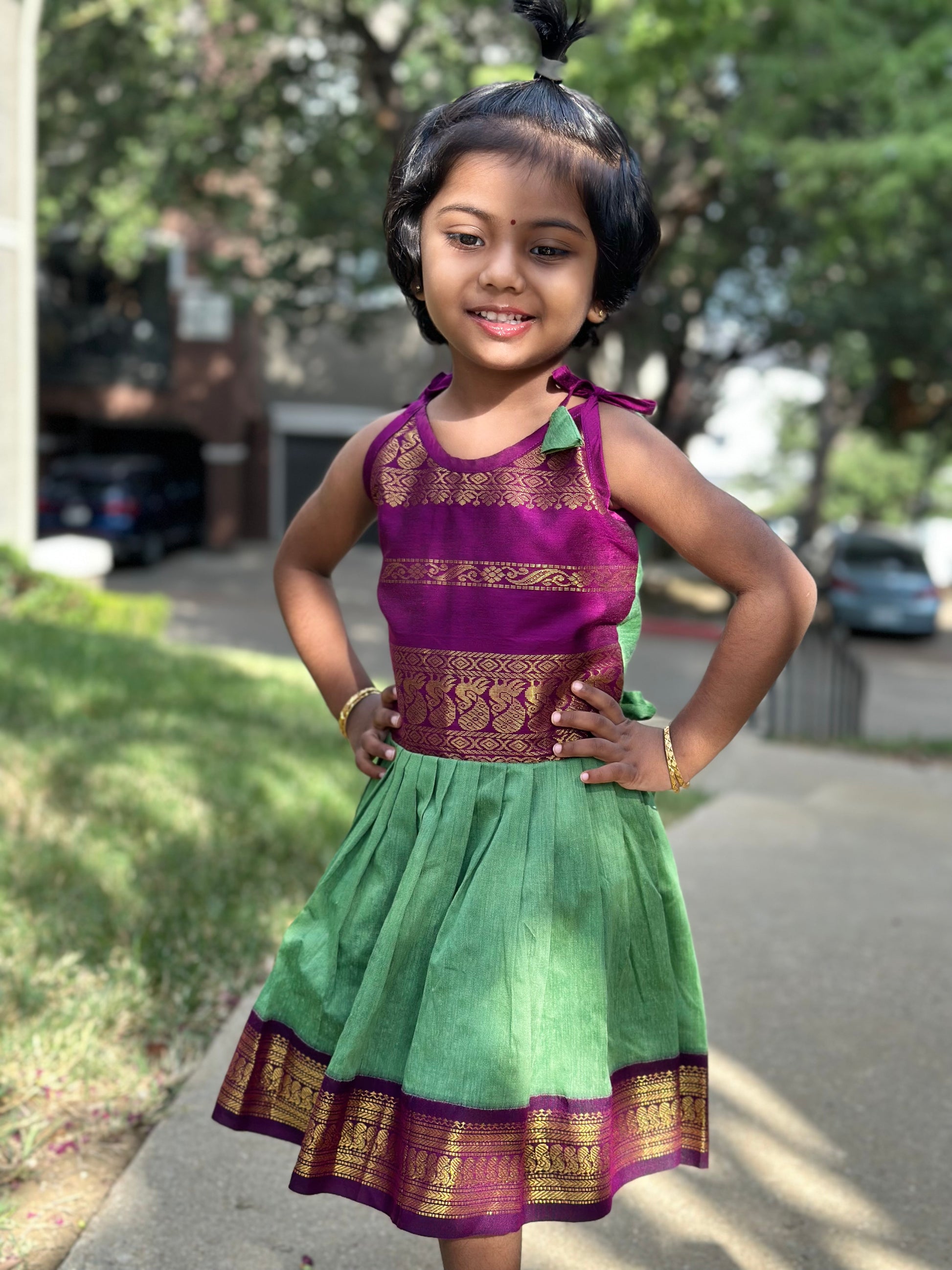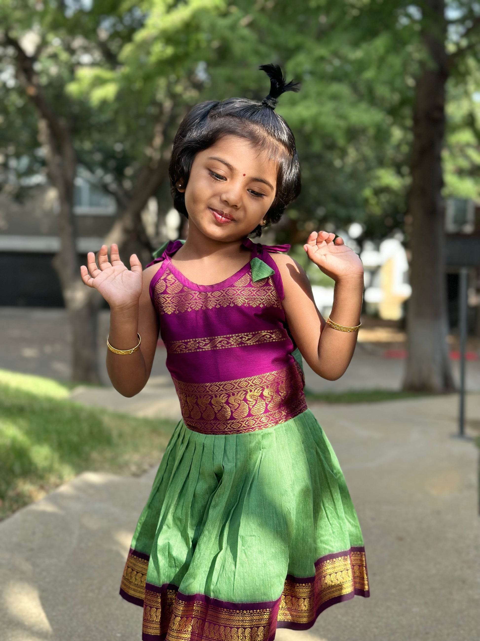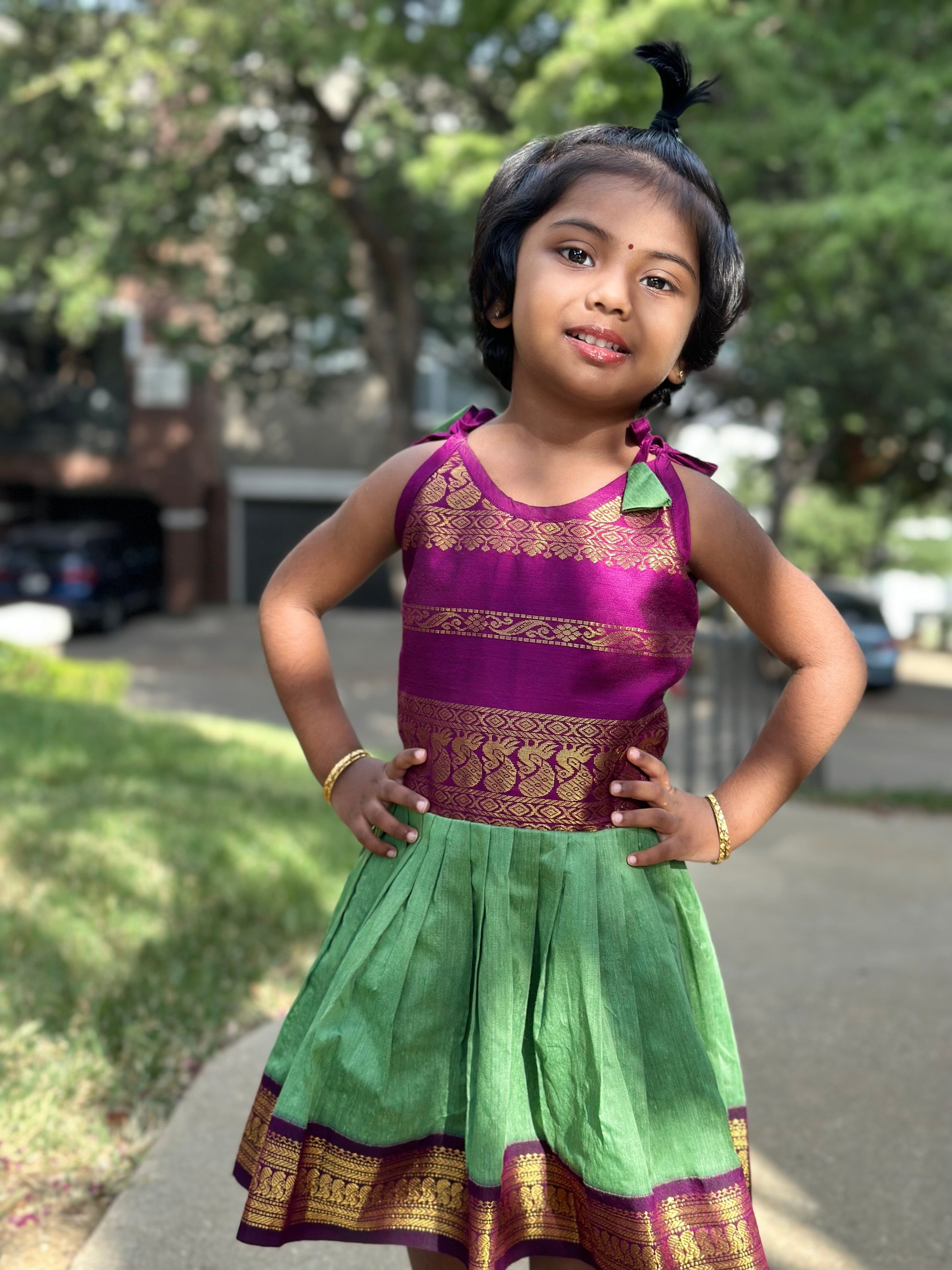This knee length ethnic frock features a vibrant combination of mint green and majenta, perfect for your little one. The tie up design and lining ensure a comfortable and stylish fit. Stand out from the crowd with this unique and eye-catching frock.
