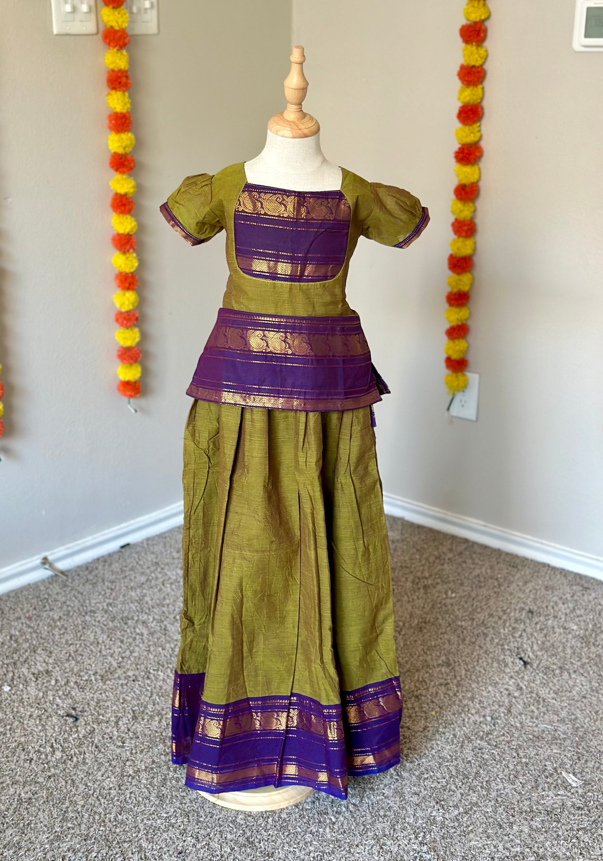This elegant Green and Purple Chettinad cotton set features a beautiful dual-tone green fabric accented with a subtle purple border. The skirt and top are lined with soft cotton for comfort and durability. Designed with stylish puff sleeves, this ensemble combines traditional craftsmanship with contemporary flair, making it perfect for both festive occasions and casual wear.