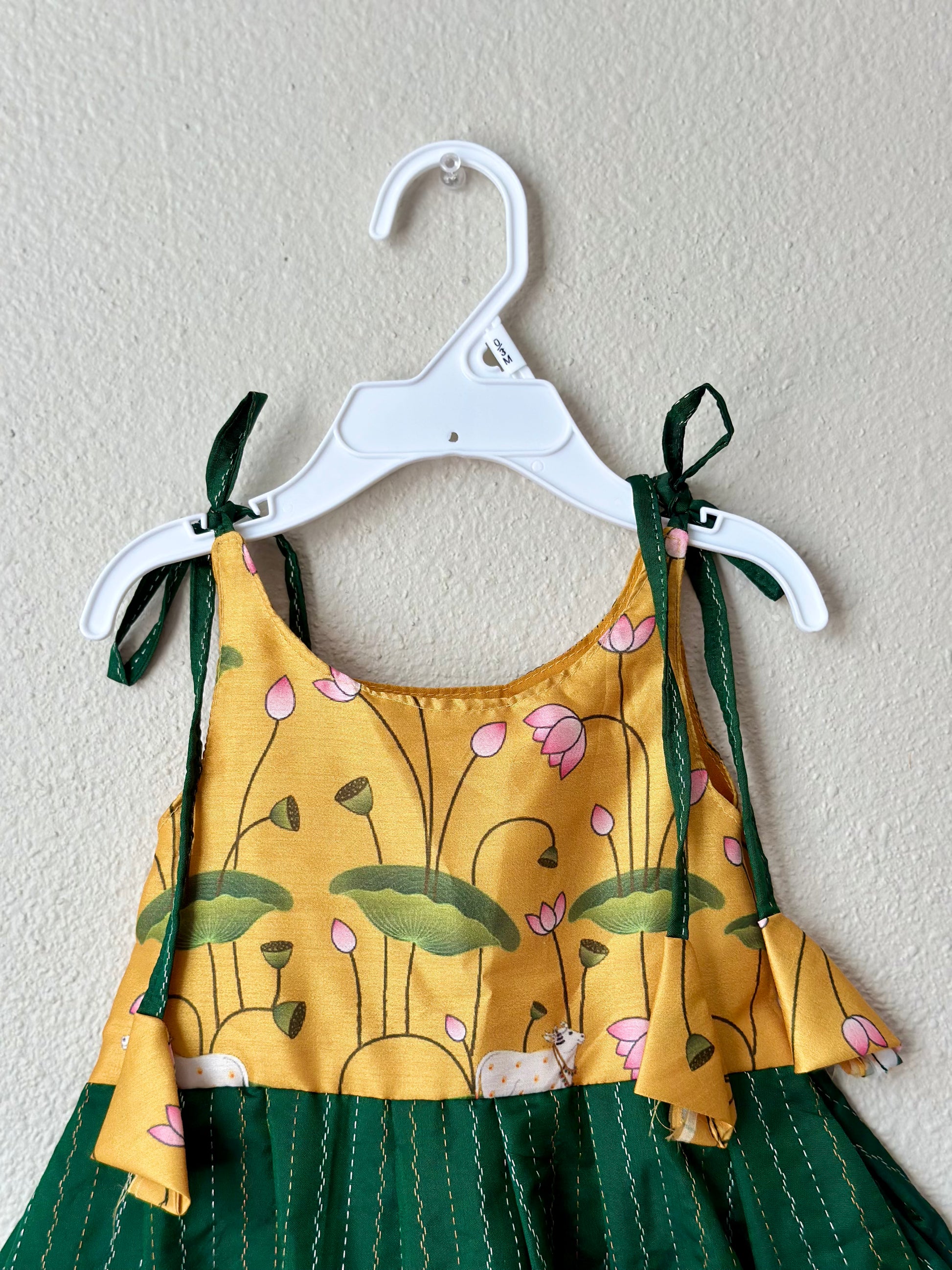 Green Pichwai Semi silk infants tie up frock