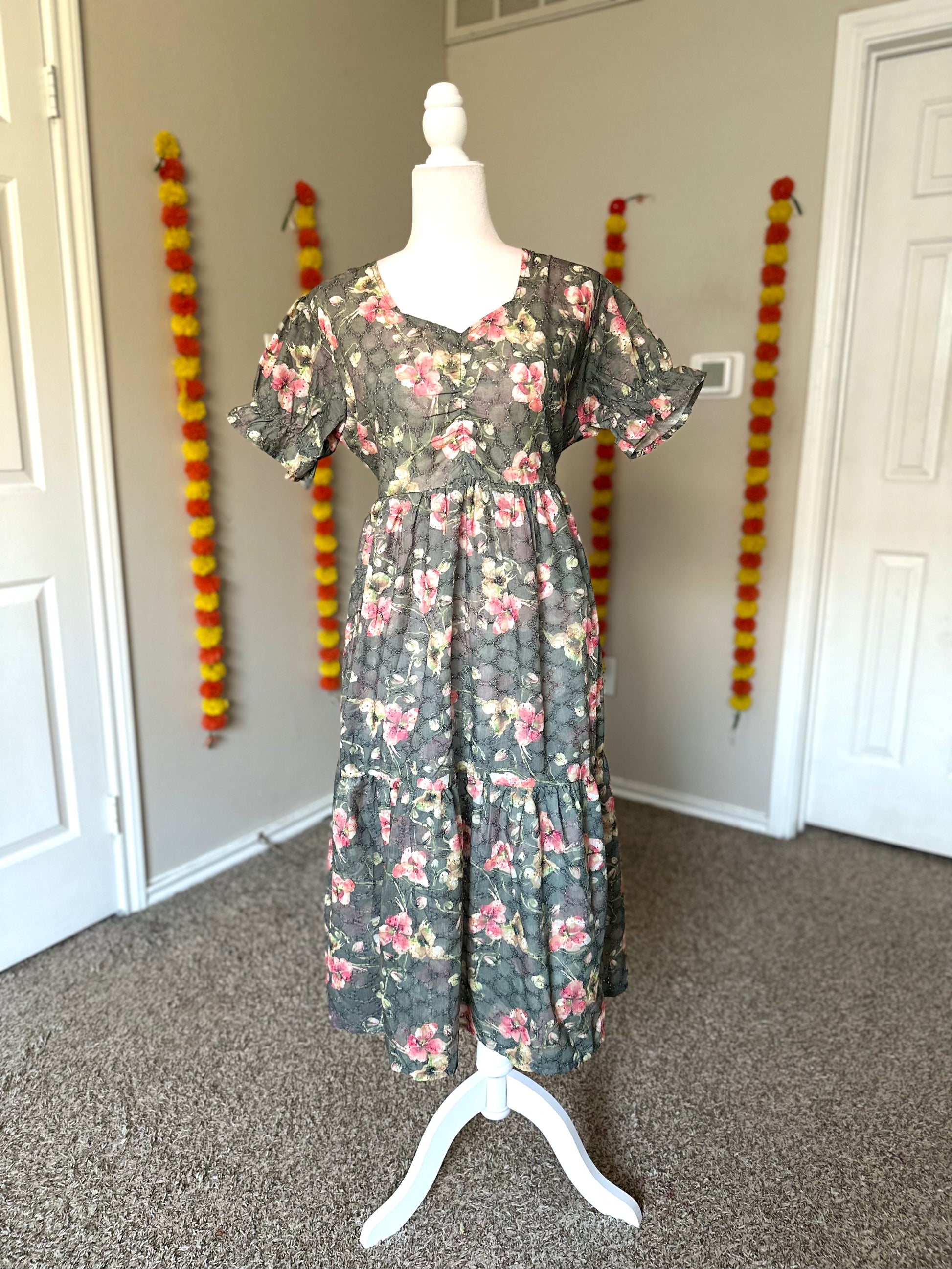 This expertly crafted Grey Floral Hakoba dress features premium cotton hakoba fabric with comfortable cotton lining. The elegant sweetheart neckline complements feminine puff sleeves with elastic detailing. Elasticated yoke provides a perfect fit while the floral pattern appeals to botanical enthusiasts. Versatile design transitions effortlessly from casual to semi-formal occasions.