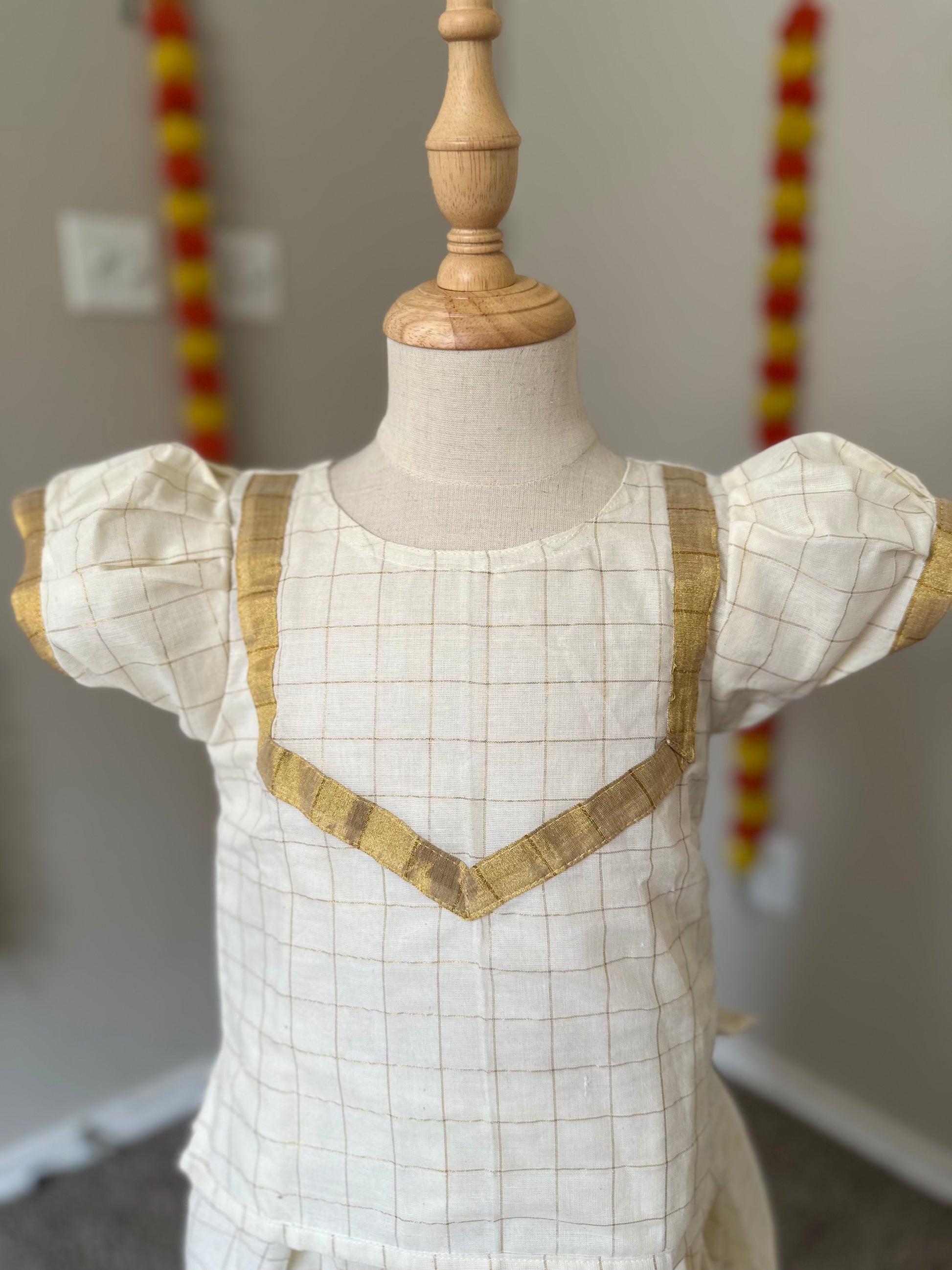 This half-white checkered Kerala-style kids lehenga features a traditional kasavu weave accentuated with a unique yoke pattern for an authentic regional touch. Crafted with a comfortable cotton lining, it ensures breathability and ease of movement. The puff sleeves are finished with a delicate border, adding subtle elegance while maintaining a child-friendly design. Perfect for festive occasions, this lehenga blends cultural heritage with modern comfort.