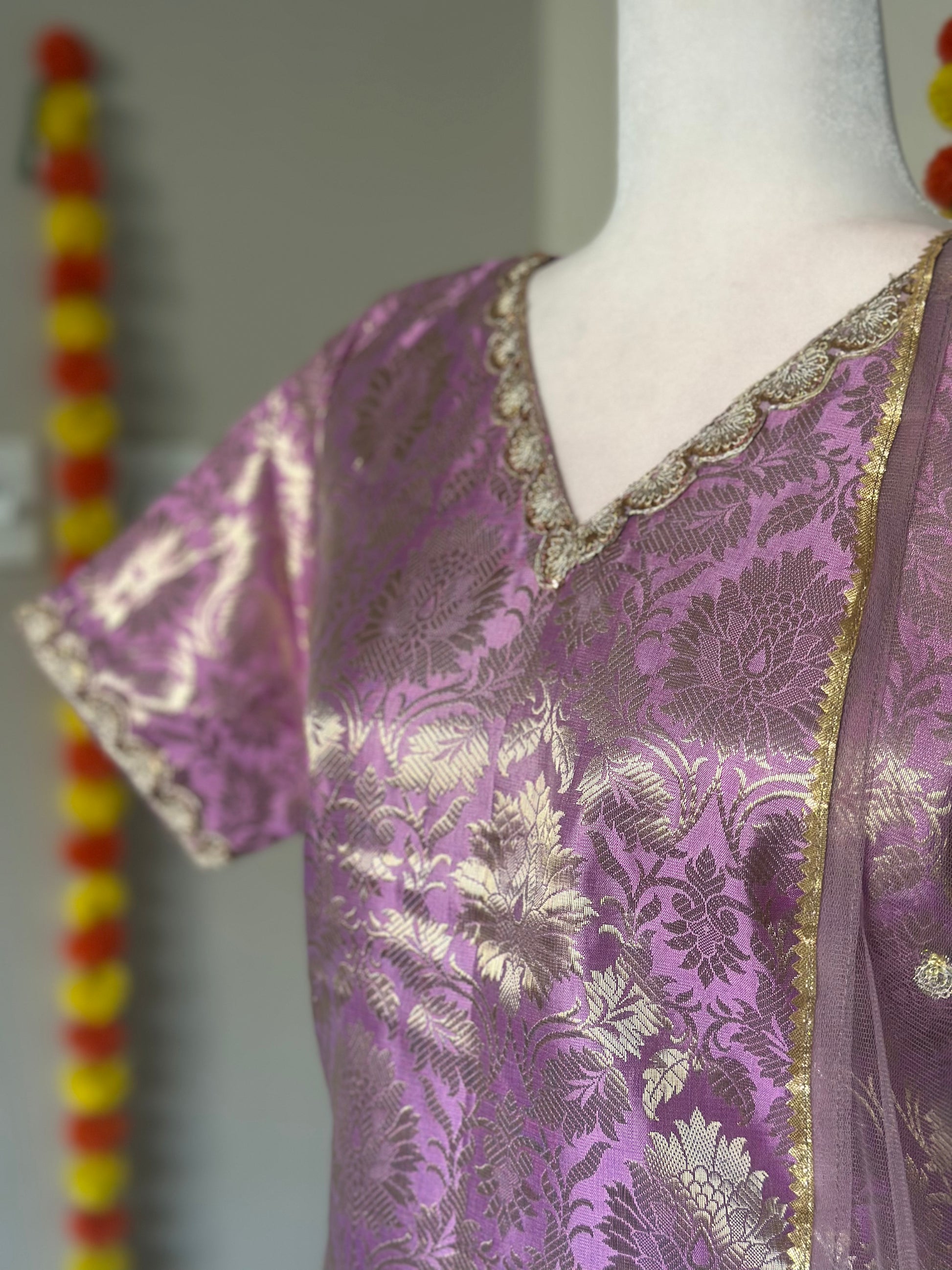 Elevate your festive wardrobe with this Lavender Banarasi Salwar Set, a refined three-piece ensemble designed for grand occasions. Crafted from premium quality Banarasi fabric in a serene lavender shade, it features subtle lace detailing for understated elegance. The raw silk matching pants complement the top perfectly, blending luxury with comfort. Ideal for those who appreciate timeless tradition with a modern touch.