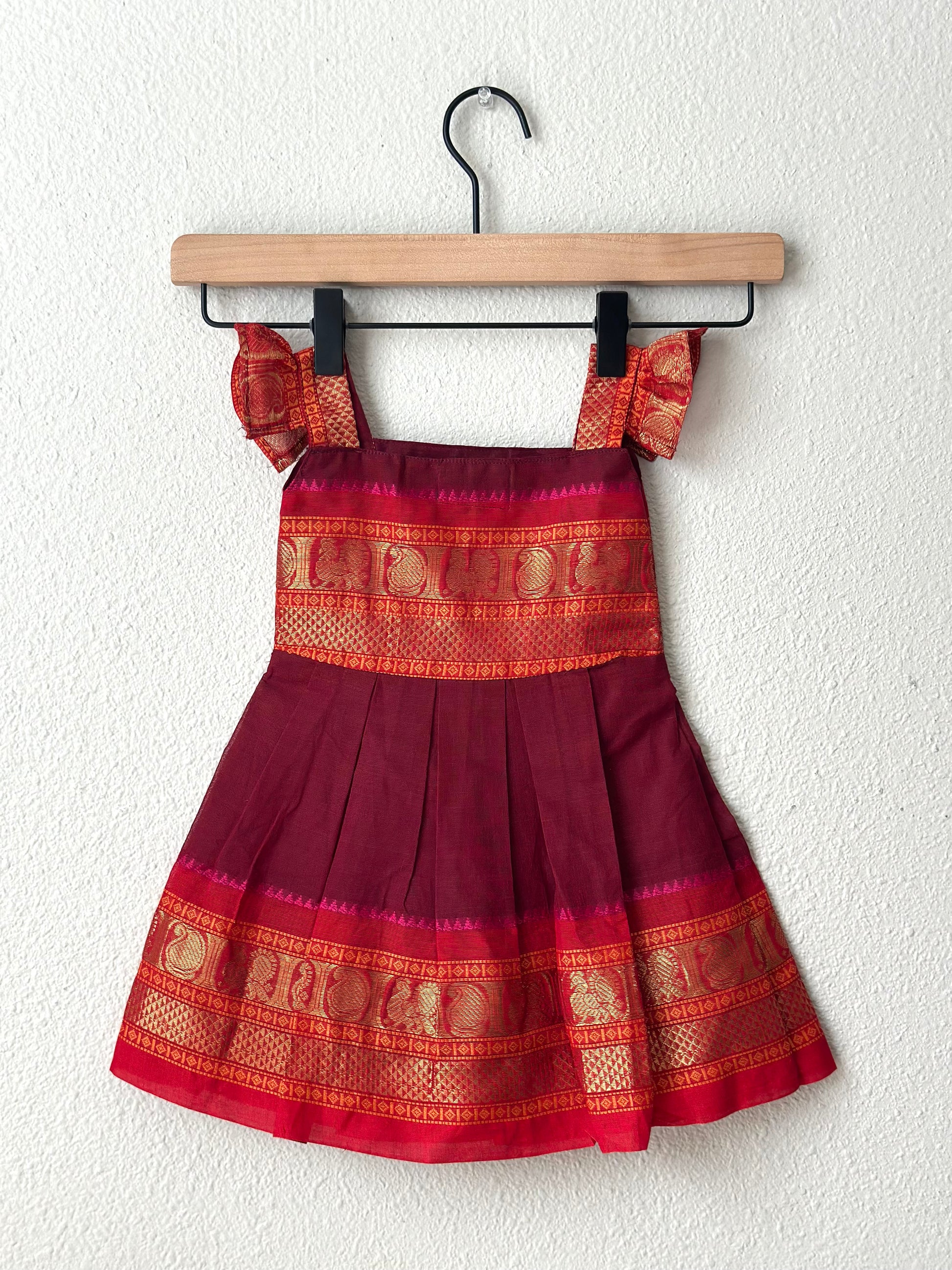 This maroon kanchi cotton infant frock beautifully replicates the rich texture and design of silk sarees while offering the breathable comfort of cotton. Expertly crafted and fully lined, it ensures softness against delicate skin and ease of wear. Its elegant color combination and traditional weaving make it an ideal choice for special occasions or everyday wear, combining style and comfort thoughtfully tailored for infants.