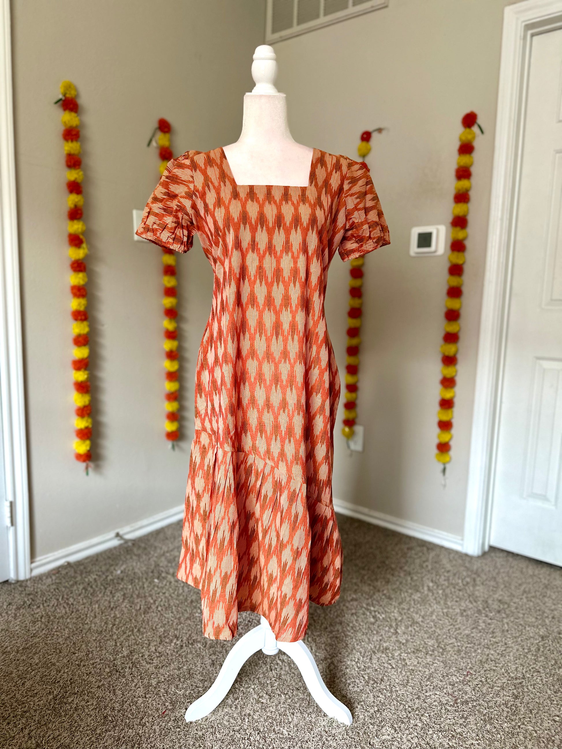 This expertly crafted A-Line Ikat dress features a distinctive asymmetrical ruffle that adds dramatic flair to its silhouette. The design combines traditional ikat patterning in vibrant orange with contemporary elements including fashionable puff sleeves and a flattering square neckline. The carefully structured A-line shape creates a balanced, feminine profile suitable for both casual and semi-formal occasions.