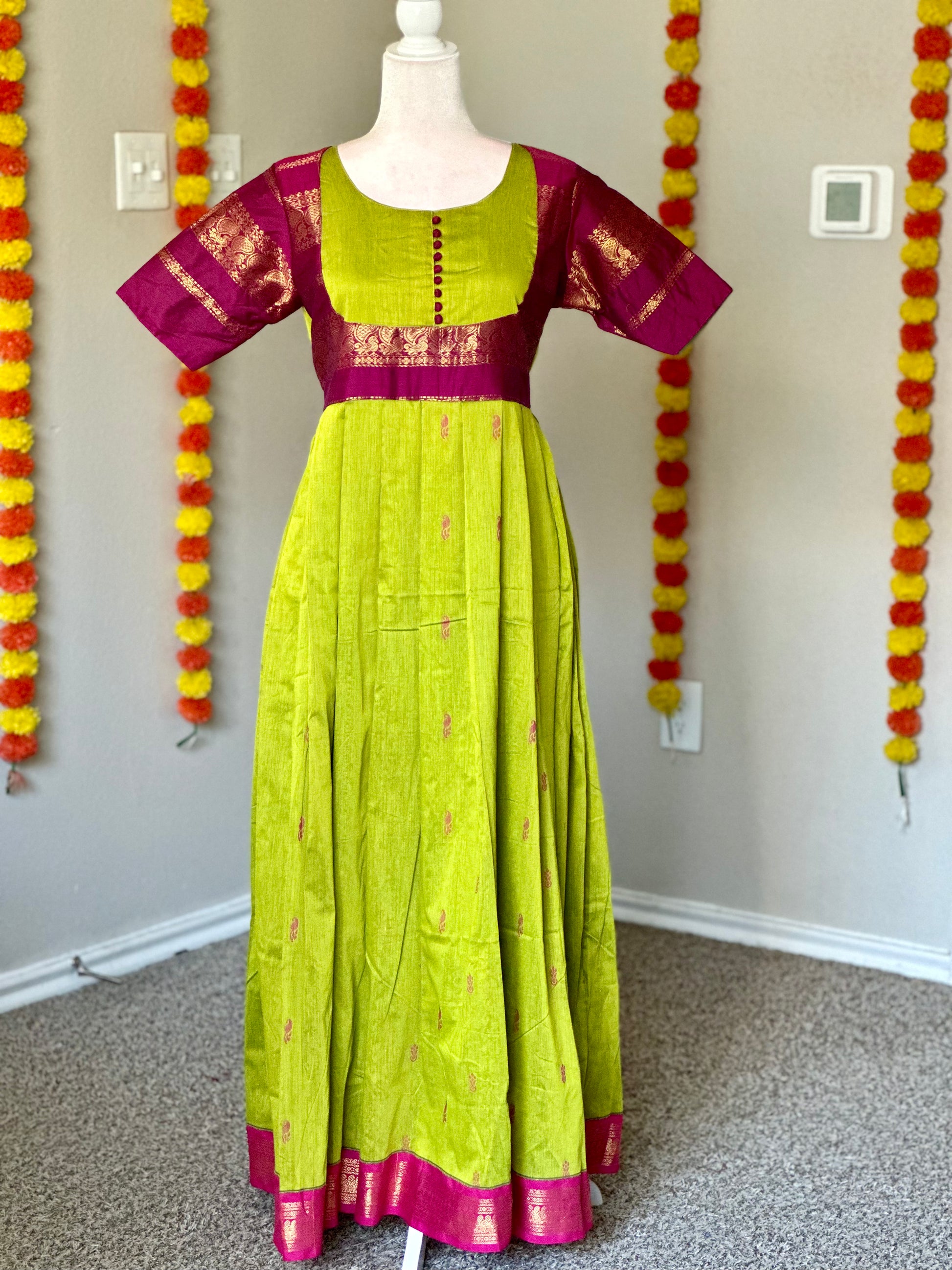 Elevate your festive wardrobe with this exquisite parrot green kalyani cotton Maxi. Meticulously crafted to deliver a grand traditional ethnic aesthetic, this garment features premium cotton lining for optimal comfort during extended wear. The authentic craftsmanship makes this piece perfect for cultural celebrations and special occasions where distinctive elegance is essential.