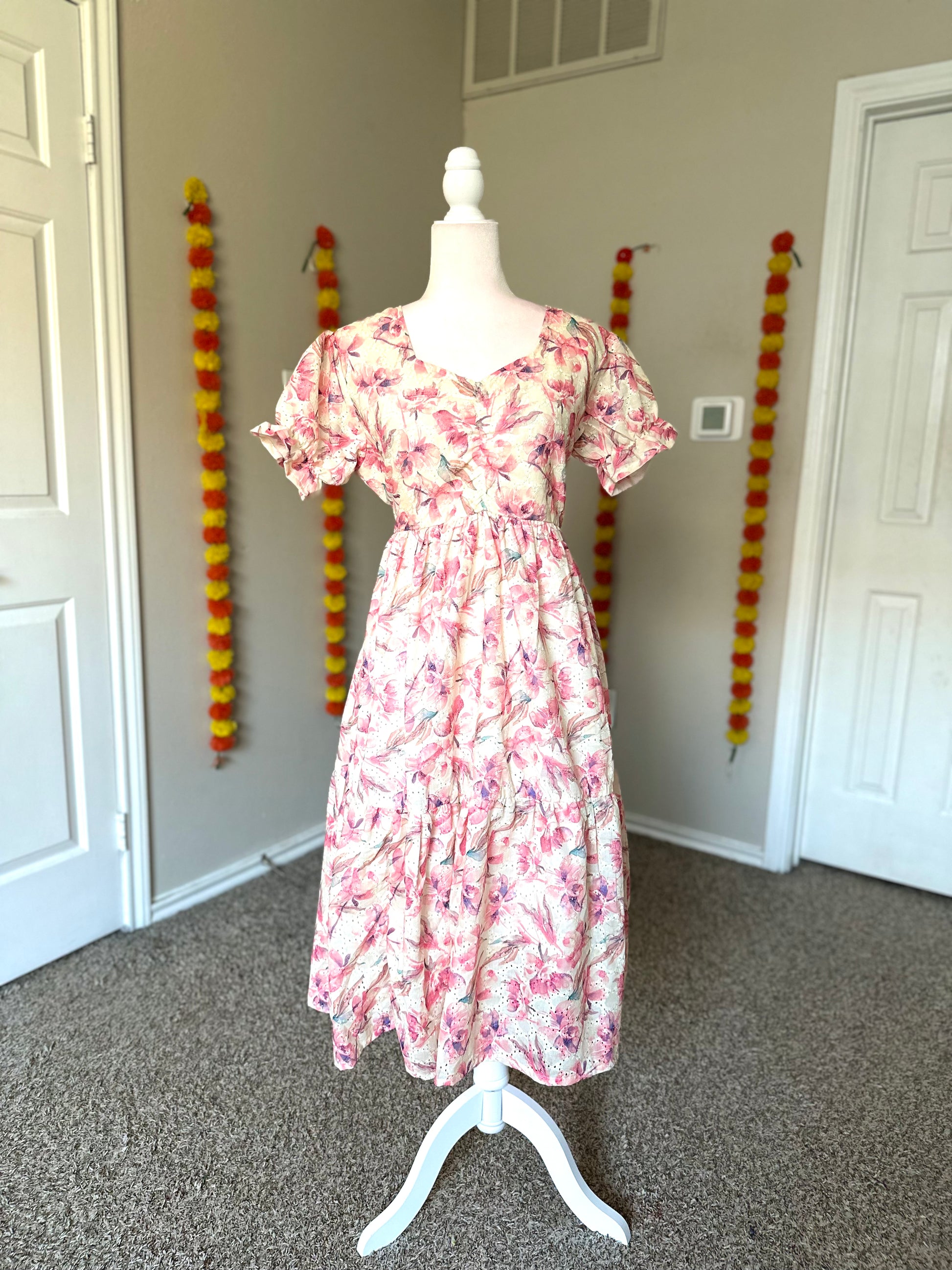 This expertly crafted white Floral Hakoba dress features premium cotton hakoba fabric with comfortable cotton lining. The elegant sweetheart neckline complements feminine puff sleeves with elastic detailing. Elasticated yoke provides a perfect fit while the floral pattern appeals to botanical enthusiasts. Versatile design transitions effortlessly from casual to semi-formal occasions.