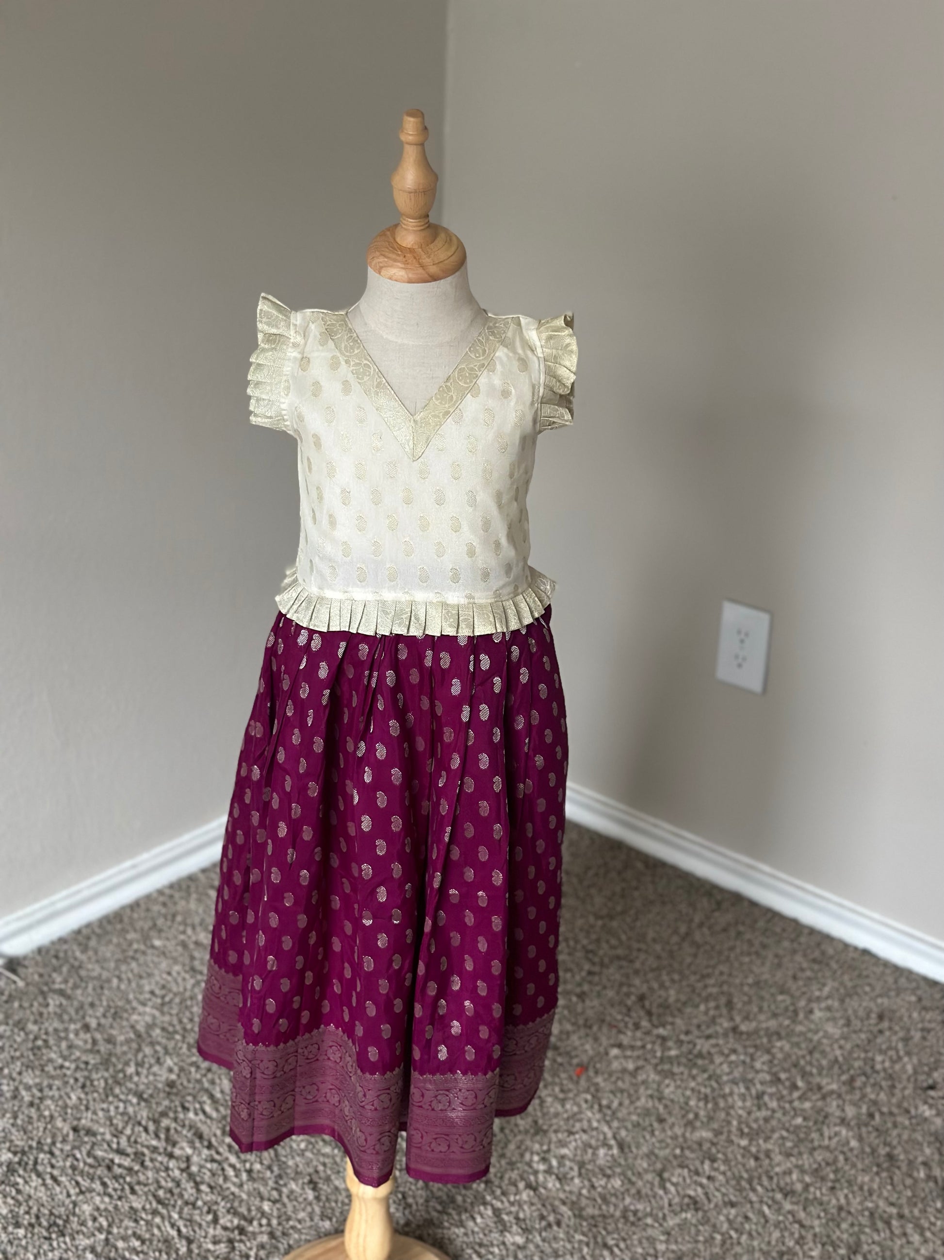 This elegant wine-colored georgette Banarasi skirt features intricate mango motifs, paired with a contrasting white top for a striking ensemble. Both pieces are lined with soft cotton, ensuring comfort alongside traditional craftsmanship. Perfect for festive occasions, this set combines timeless design with breathable fabric for a refined look.